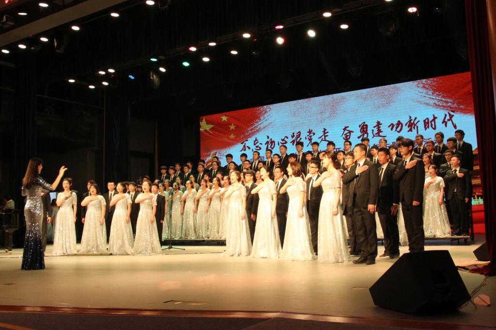 银色的礼服、黑色的西装,在灯光的照射下格外夺目,每个人的脸上都洋溢着自信的微笑。随着指挥和钢琴的配合,一曲格调激昂的时代红歌喷薄而出。“总想对你表白,我的心情是多么豪迈,总想对你倾诉,我对生活是多么热爱”,这是我们因国家而感到的自豪,是我们对于新时代新生活的态度;“勤劳勇敢的中国人,带领我们走进新时代”是对中国人民无限的赞美;“当家做主站起来”、“改革开放富起来”、“高举旗帜开创未来”是我们对于新时代最美好的祝福。