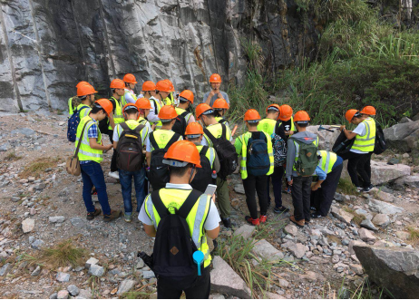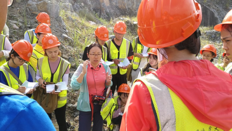 佘振兵在下岸溪石料厂给061161班学生讲解矿物的野外识别方法(9月3日)