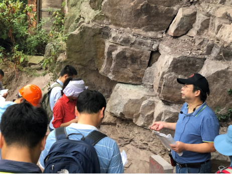 杨宝忠在九畹溪桥头给李四光学院0201165班学生讲解石龙洞组地层(9月3日)