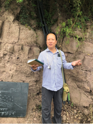 杨宝忠在给带班教师讲解沉积岩的野外教学方法(8月22日)