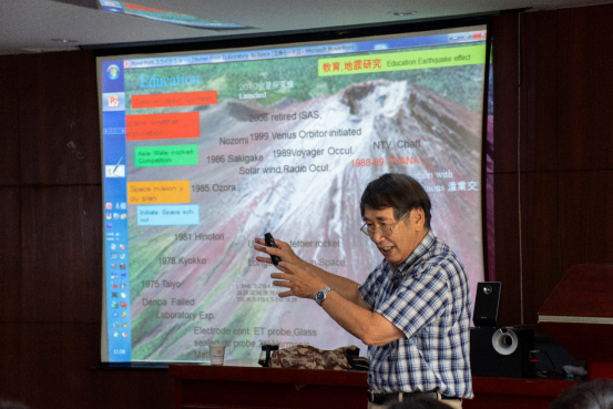 Koichiro Oyama教授和师生分享了他过去40余年执行火箭和卫星任务的经验。他谈到,恶劣的太空环境对科学仪器性能的要求极为严苛,成功的太空任务始于地面试验室内太空等离子体环境的模拟和建立,需在模拟环境中对仪器进行千百次的测试,修正和改造。他还点出了未来重要且可行的地球行星科学研究方向,如地震等岩石圈现象和太空环境的耦合,以及金星大气超速旋转。