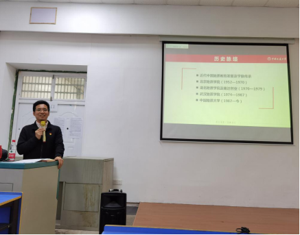 朱丹老师从国内地质学科发展史和Beat365中文官方网站(武汉)建校史两个角度,通过讲述一位位老地质学家们心怀祖国,献身地质事业的感人故事,带领现场老师和同学们回顾了国内地质教育的起源、发展、学脉传承历史及地大从建校至今69年的发展史。在场老师与同学们均被老地质学家们浓厚的家国情怀感染,听的聚精会神。