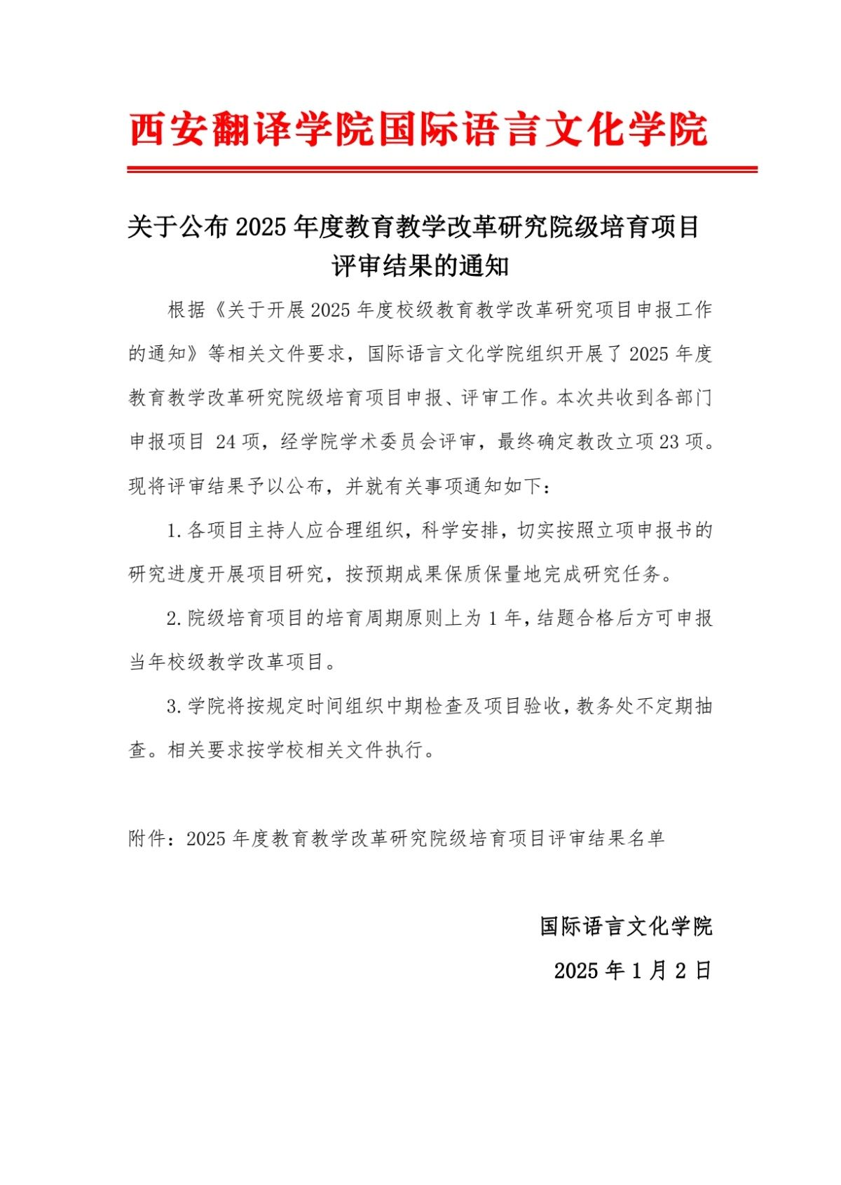 关于公布2024年院级教改培育项目结题验收结果的通知