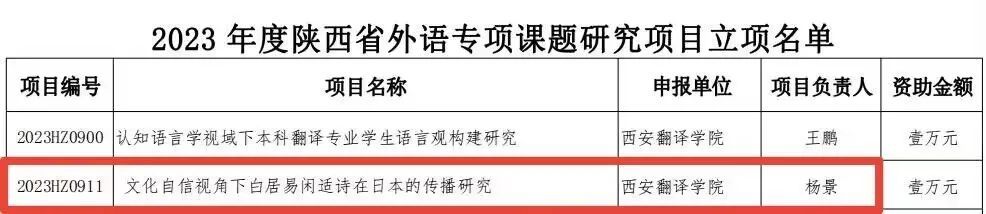 近日,陕西省社科联公布了“2023年度陕西省外语专项课题研究项目”立项名单,我院杨景老师主持的项目《文化自信视角下白居易闲适诗在日本的传播研究》(项目编号:2023HZ0911)获批立项。