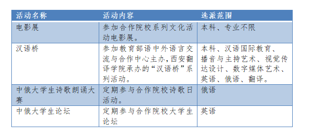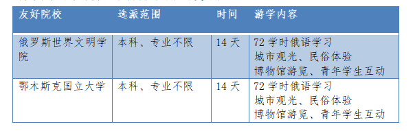 为丰富我校学生课余生活,拓展其国际视野,提升其综合素质,设有俄罗斯游学团文化交流项目,分为冬令营与夏令营。