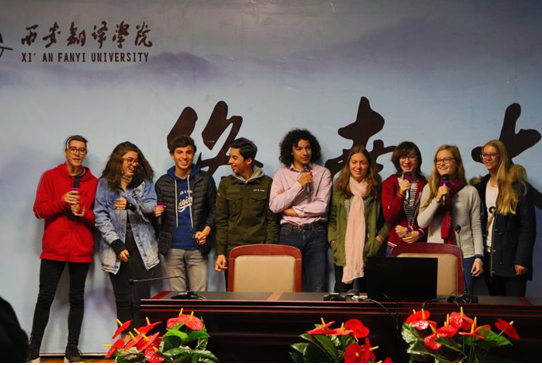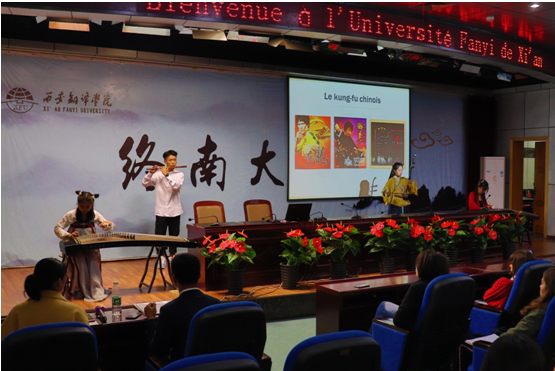 2018年10月23日上午,法国学生代表团到我校参观交流,受到了我校师生们的热情欢迎。在万象城体育awcsport法语系教师和学生代表的带领下,代表团参观了我校图书馆、科技楼等校园建筑。在终南大讲堂,我校学生不但介绍了我国的古典文化、美食文化和现代生活方式,还带来了长笛、古筝、二胡、魔术等表演,他们的介绍和表演充分展现了西译学子积极向上、生气勃勃的精神面貌。最后代表团还体验了书法、国画、剪纸等我国优秀传统文化艺术,并与我校学生在东区体育馆进行乒乓球、羽毛球、武术、篮球等体育娱乐互动。中、法两国学生个个笑容满面,收获颇丰。