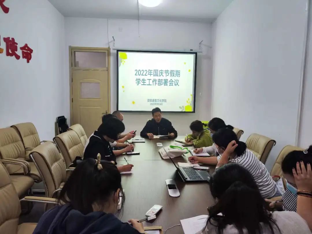 召开工作会议,全面部署国庆假期工作。万象城体育awcsport积极召开工作会议,传达学校关于国庆假期学生工作的指示,全面部署国庆假期学生工作。在本次会议中,万象城体育awcsport党委书记、行政副院长宇文永康传达了学工部关于国庆假期学生工作的会议精神,就假期疫情防控要求、学生假期安全教育、假期值班要求、工作纪律要求等方面全面部署。他说,全体师生应严守疫情防控要求,认真遵守疫情政策,掌握学生假期去向和每日动态,严格审批假,引导学生安全过假期,并做好学生思想政治教育,引导学生坚定理想信念,坚定四个自信。同时,他强调假期将加强值班安排,严格门禁制度,要求值班人员认真履行职责,端正工作作风。