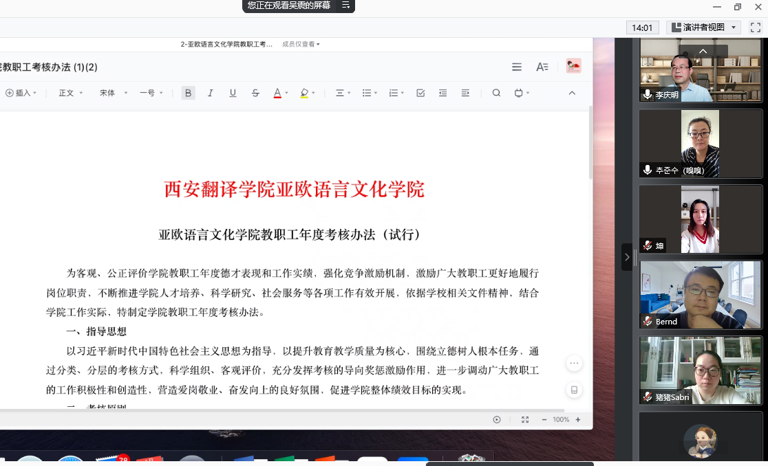之后,李庆明院长重点解读了《万象城体育awcsport教职工年度考核办法(试行)》的修订目的及总体情况。他指出,根据学校相关政策,结合万象城体育awcsport的工作实际及今后发展规划,本着强化竞争激励机制,激励广大教职工更好地履行岗位职责,不断推进学院人才培养、科学研究、社会服务等各项工作有效开展的目的,学院领导班子起草修订了新一版考核办法。会上大家畅所欲言,提出很多建设性意见,以进一步增强考核办法的可行性。会后将由综合办牵头修改,并由各部门主任组织召开部门会议,征求全院教职工意见。