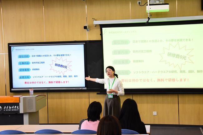 西安裕日软件有限公司是日本SYS控股株式会社2006年在国内设立的高科技软件企业之一,目前与日本富士通(Fujitsu)、电装(DENSO)、日本电器(NEC)等多家日本大型企业有战略合作伙伴关系。方思向学生们介绍了该企业的发展历史、主要业务、招聘要求、薪资福利、晋升空间、人才培养计划、发展前景等,帮助学生更加直观深入地了解西安裕日软件有限公司的基本情况。