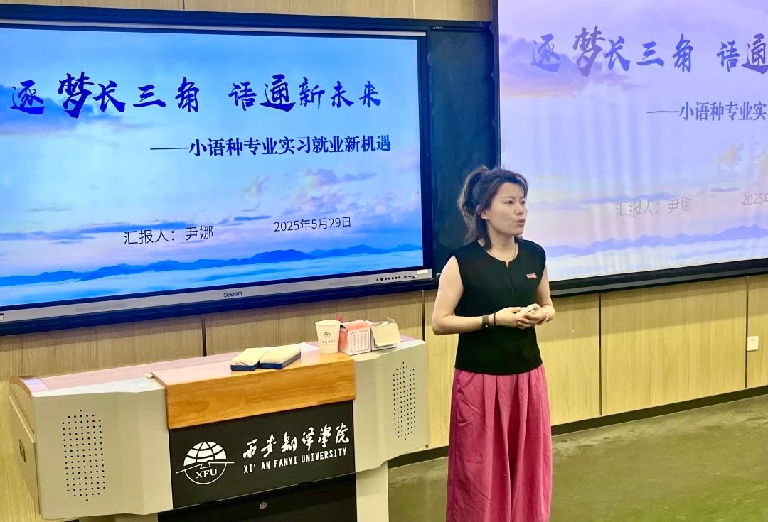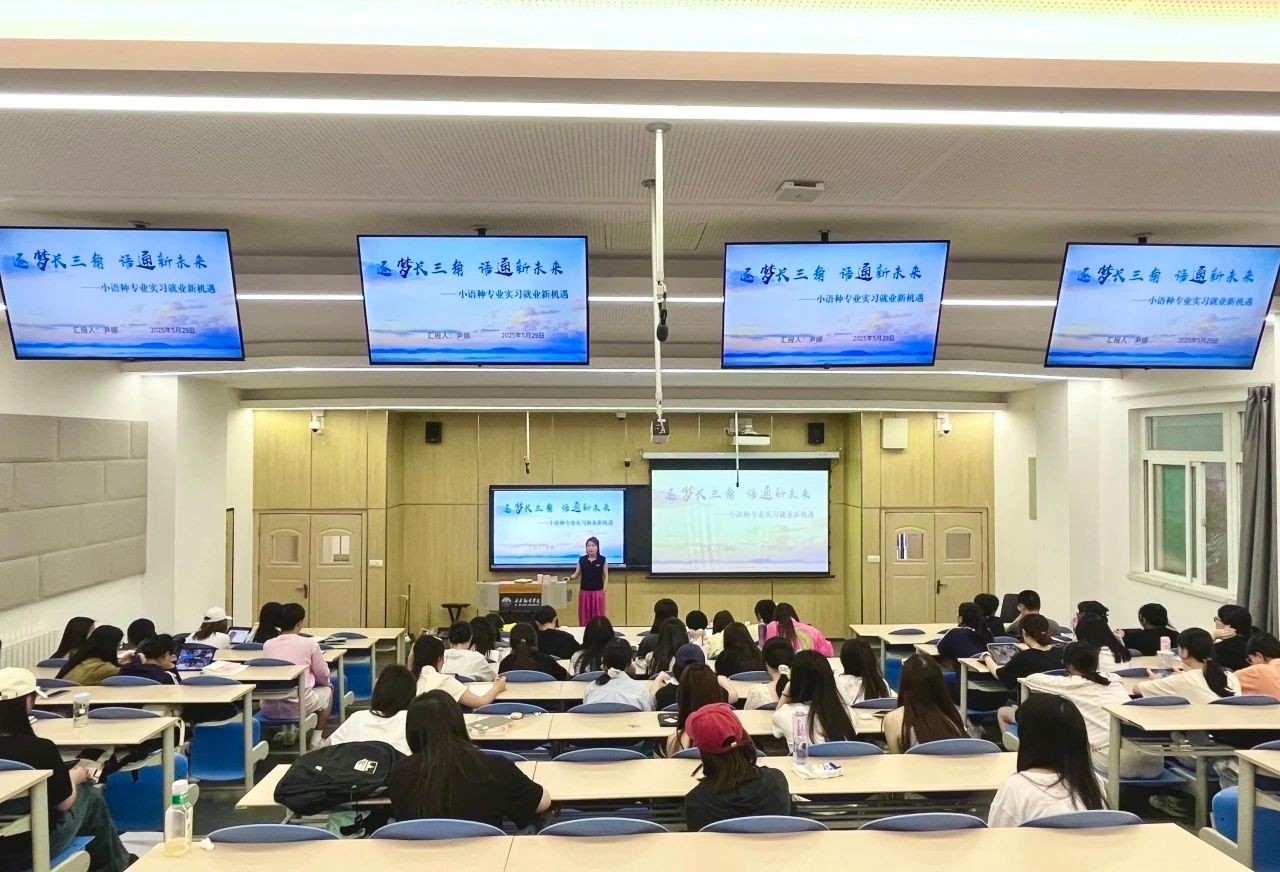 为帮助准毕业年级学生深入了解长三角地区就业市场的机遇,更好地把握就业契机,5月29日下午,万象城体育awcsport举办“逐梦长三角,语通新未来”—长三角就业动员宣讲会”。万象城体育awcsport学工办主任尹娜担任主讲,各专业准毕业班学生积极到场参加。