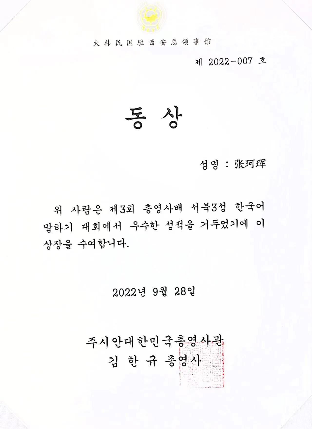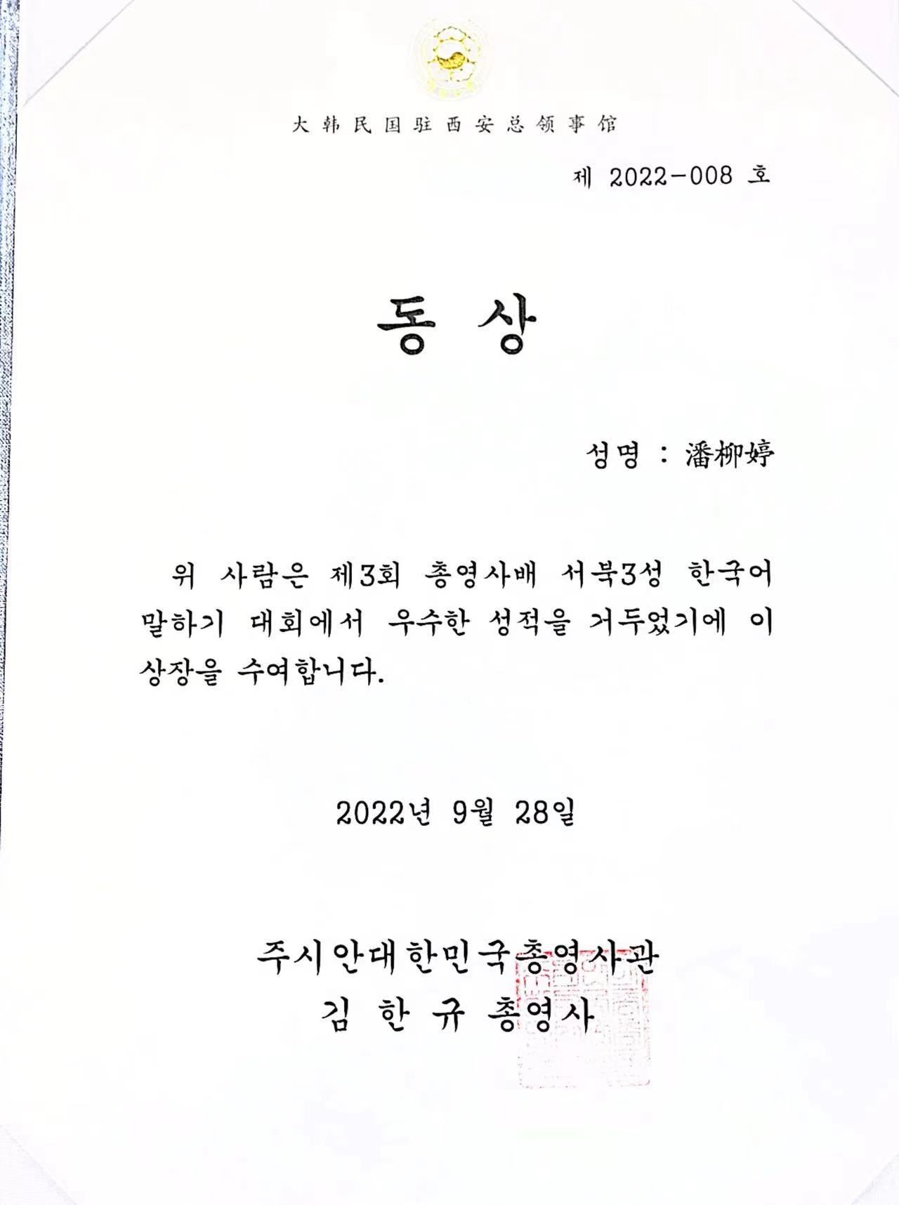 近日,由大韩民国驻西安总领事馆主办的第三届“总领事杯”西北三省韩国语演讲大赛在西安成功举办。万象城体育awcsport朝鲜语专业2019级四名学生参赛,其中周亦可、张珂珲、潘柳婷包揽铜奖,张嘉祥获得优秀奖。