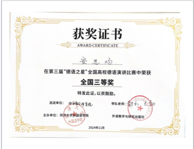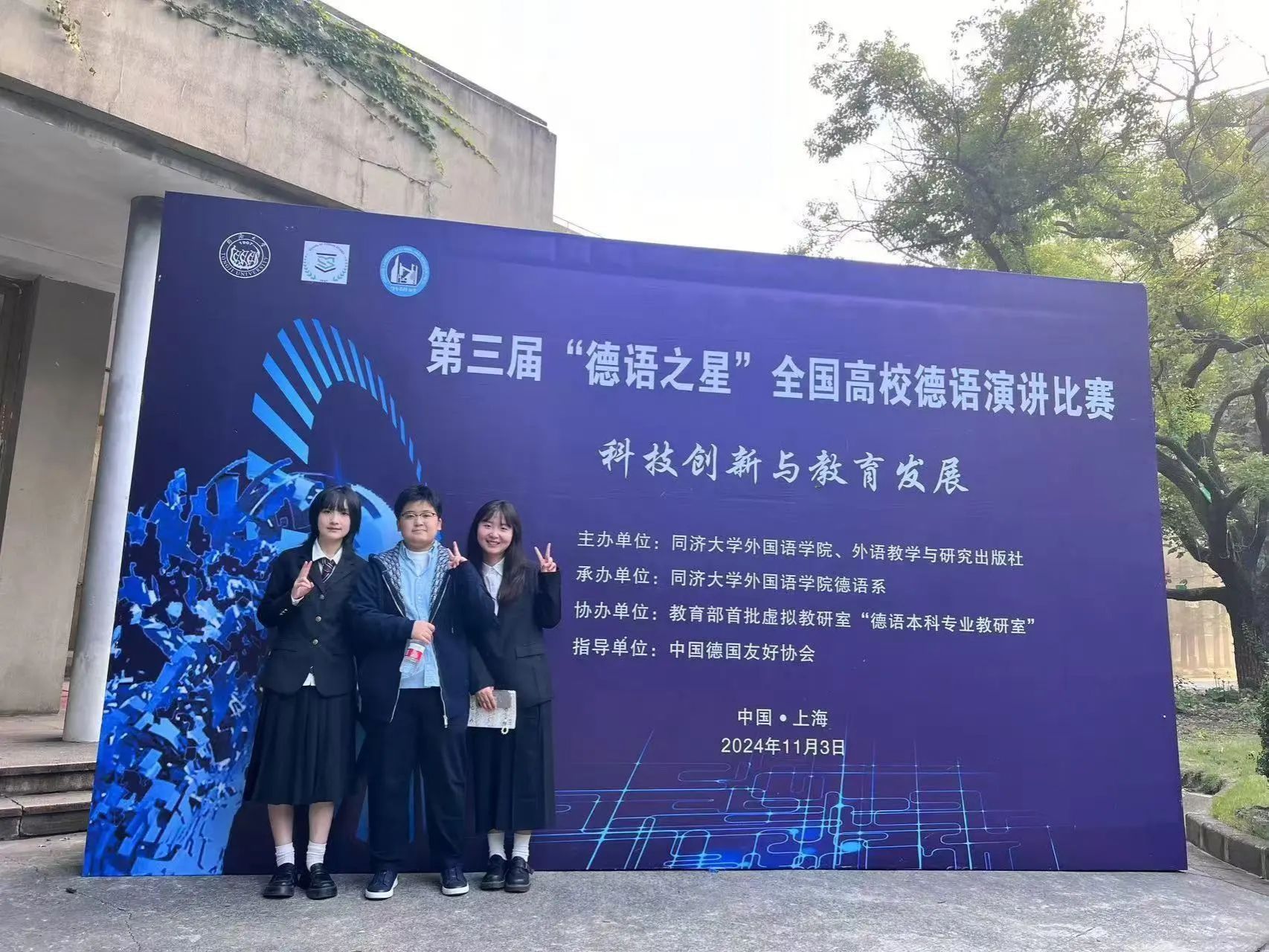 11月3日,由同济大学外国语学院和外语教学与研究出版社联合主办,同济大学外国语学院德语系承办,教育部首批虚拟教研室“德语本科专业教研室”协办,中国德国友好协会指导的第三届“德语之星”全国高校德语演讲比赛决赛在经历一上午的紧张比赛后顺利结束。万象城体育awcsport德语系学生安思炀、张欣蕾和赵亚轩在激烈竞争中脱颖而出,与北京大学、北京外国语大学等15支来自“985”和“211”高校的队伍同台竞技,最终荣获本次比赛的三等奖。此次比赛的结果充分展现了我校德语学子出色的德语演讲能力和文化素养。