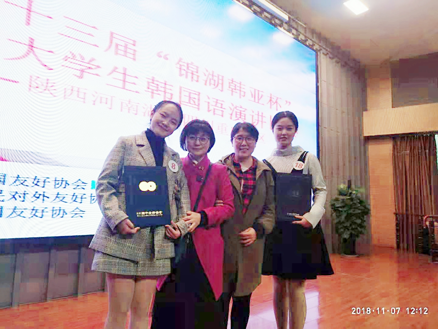 本次大赛由韩中友好协会、中国人民对外友好协会、中韩友好协会主办,赛事共分为两部分,分别为定题演讲和看图说话,比赛中我校15级学生王品懿、李卓奚以扎实的语言功底,自然的语音、语调,稳定的现场发挥,优秀的临场应变能力赢得在场评委的一致肯定,分别获得三等奖、优秀奖的佳绩。王品懿同学将于12月中旬赴韩国参加总决赛。同时,我校大四和大一全体学生也通过现场观赛应援,得到了宝贵的学习机会。