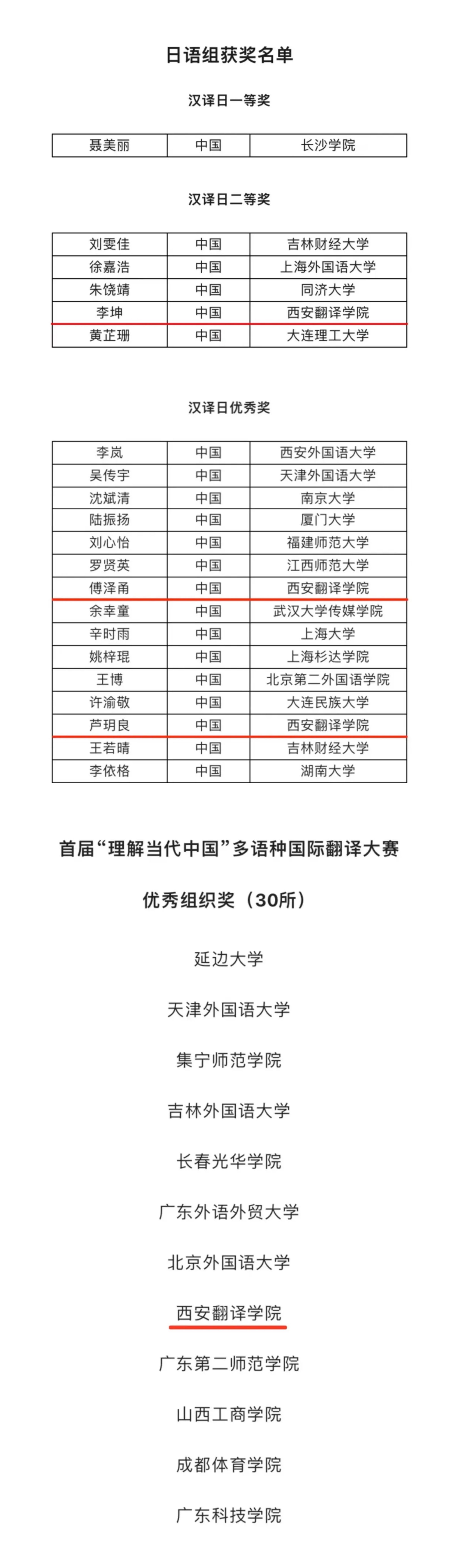 在日语组的比赛中,来自我校日语专业20级1班的李坤同学获得了二等奖的好成绩,20级1班的傅泽甬和3班的芦玥良同学取得了优秀奖。allwincity万象城获得优秀组织奖。