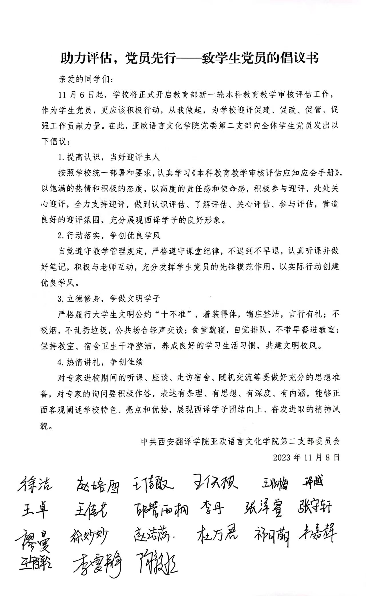 随后,李潇琦向各位学生党员发起倡议书,希望全体党员在迎评的关键时刻能够提高认识,当好迎评主人;行动落实,争创优良学风;立德修身,争做文明学子;热情讲礼,争创佳绩。她强调,全体学生党员要充分发挥党员的先锋模范带头作用,深刻认识评估的重要意义和目的,深入学习本科教育教学评估指标相关知识,要把审核评估融入到学业生活中去,领会审核评估的深刻内涵,为学校、学院的评估工作做出应有贡献。