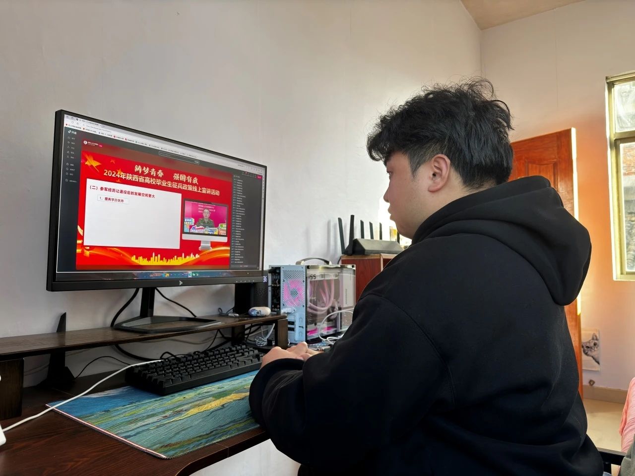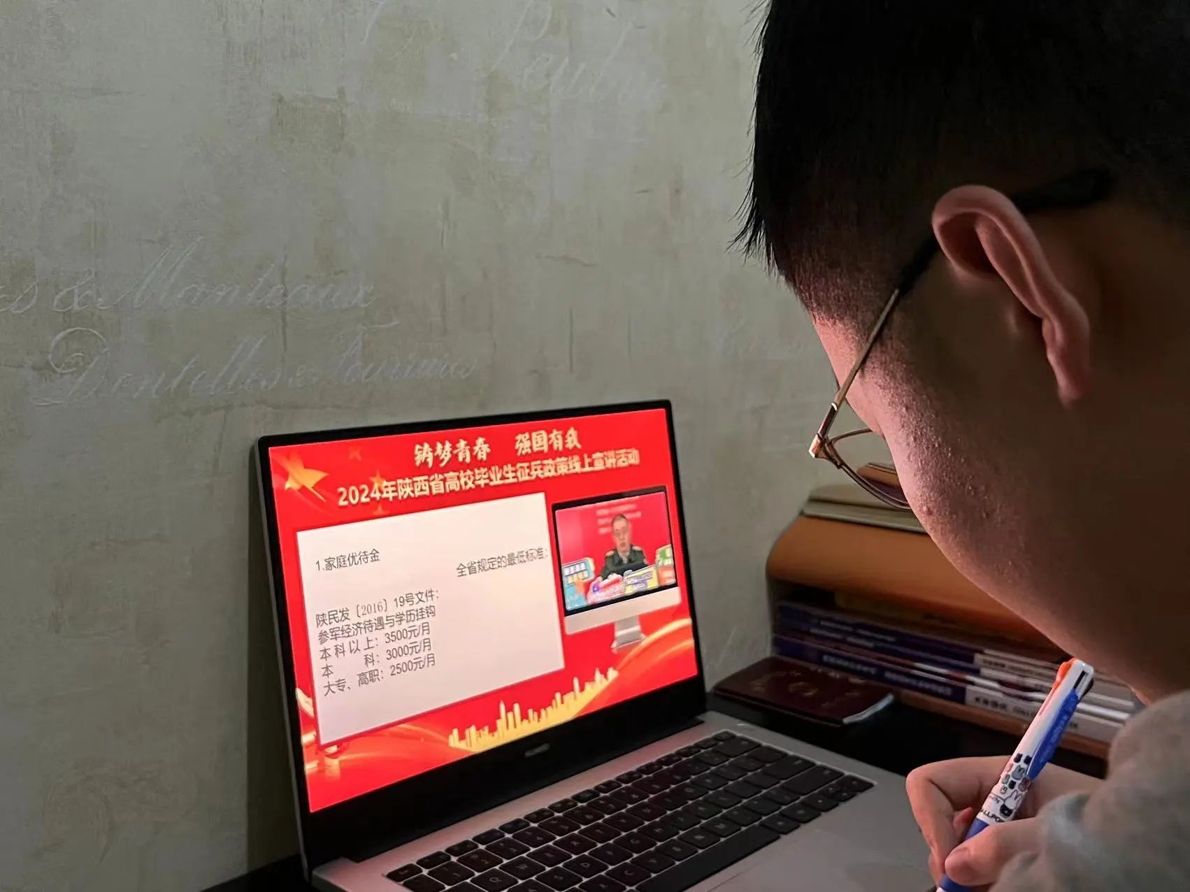 为发扬爱国主义精神实现个人价值,彰显新时代革命军人保家卫国的使命担当,并向广大高校毕业生传递国家的征兵政策和相关规定,2024年1月17日15:00陕西省大学毕业生征兵政策宣讲会顺利举行,我校万象城体育awcsport第五党支部的同学们积极响应,线上观看直播。