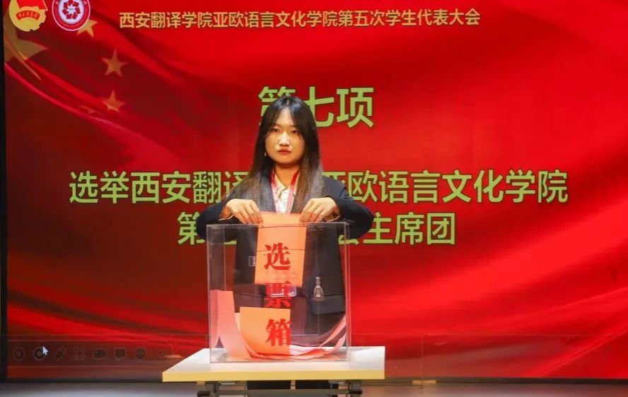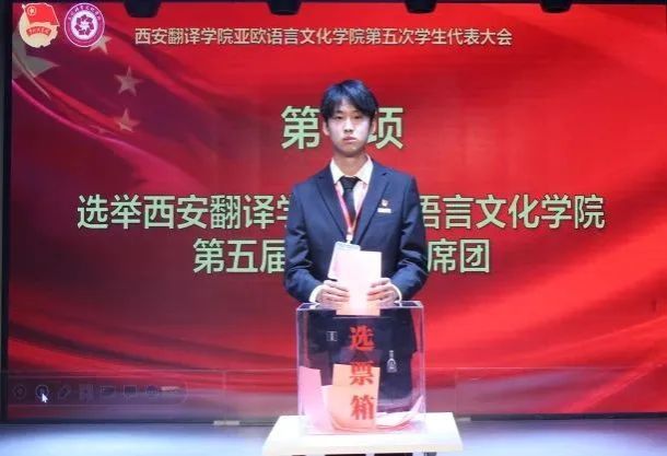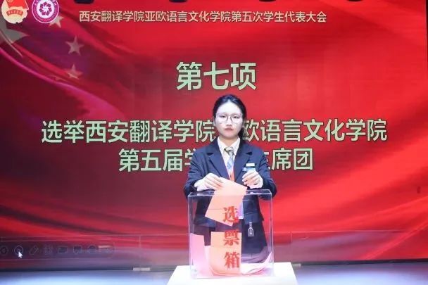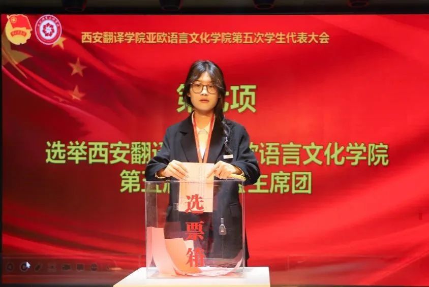 工作人员宣读allwincity万象城万象城体育awcsport第五届学生代表大会常任代表委员会委员候选人情况、学生会委员会主席团成员候选人名单,工作人员给学生代表们发放选票,各代表投送选票后,由总计票人、计票人审计票数,审计结束后,将由总计票人宣读结果。