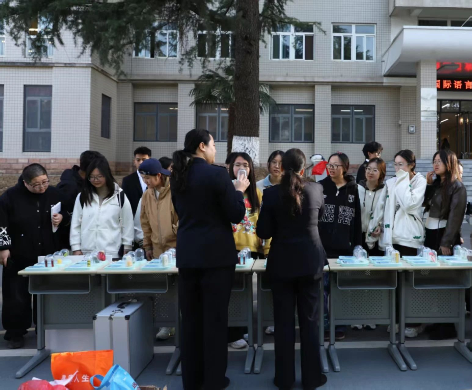 宣讲团的警长们在四号楼门前,进行仿真毒品模型展示与解说。