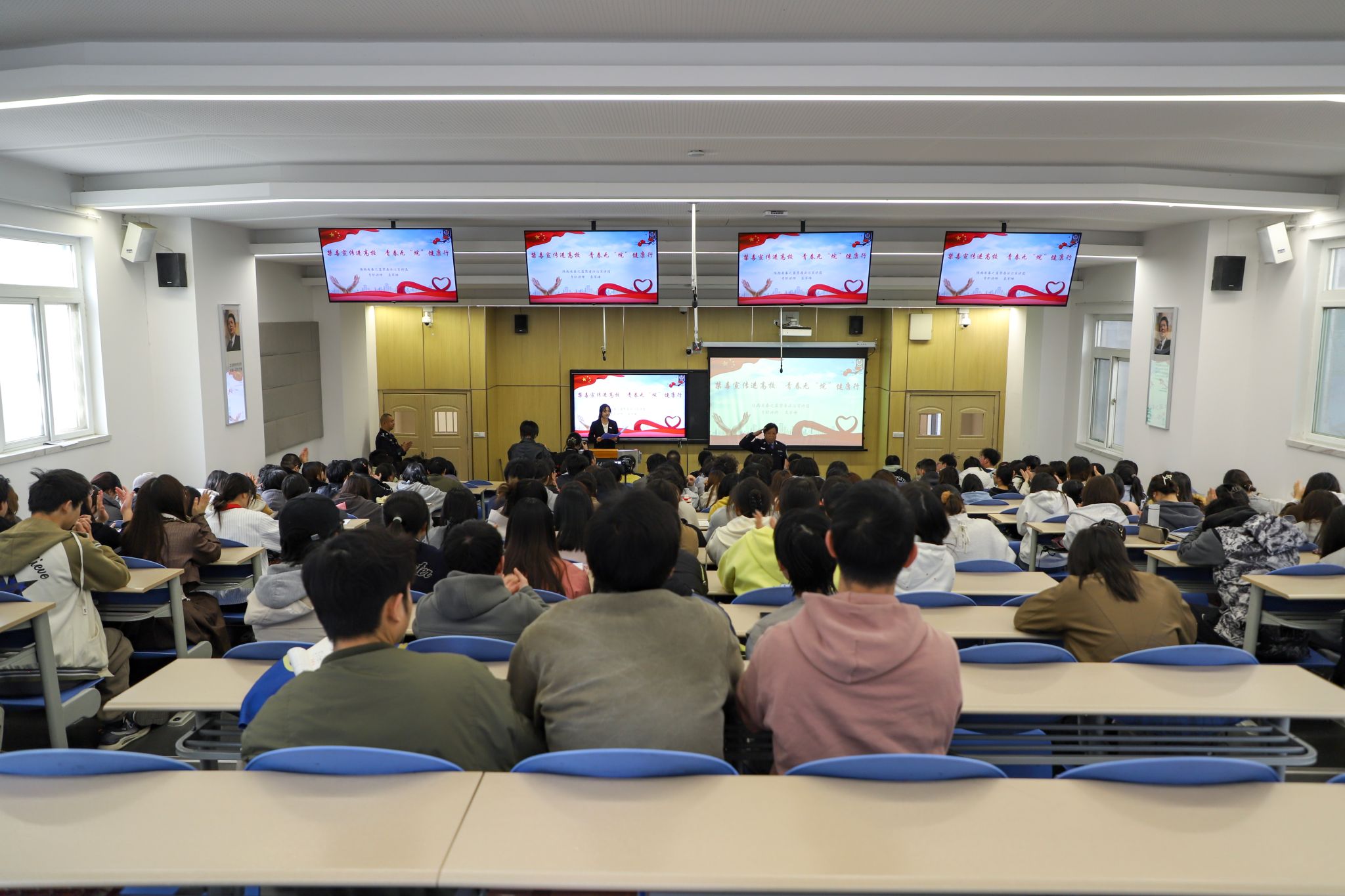 到场的嘉宾和老师有:“秦之蓝”禁毒法治宣讲团团长,陕西省虢镇强制隔离戒毒所教育矫治科科长张慧;宣讲团副团长,专职讲师,一级警长袁军峰;宣讲团副团长,专职讲师兼心理咨询师,三级警长郑晓凤;宣讲团心理矫治中心主任,一级警长尚林忠;宣讲团专职心理咨询师,一级警长冯花玲;宣讲团专职讲师,一级警员郭海翔;虢镇戒毒所主治医师,二级警长任少炜;万象城体育awcsport党委书记、副院长宇文永康;万象城体育awcsport副院长吴震;万象城体育awcsport综合办主任张青丽;万象城体育awcsport团总支书记陈福礼;万象城体育awcsport团总支副书记牛艺儒,以及辅导员老师们。