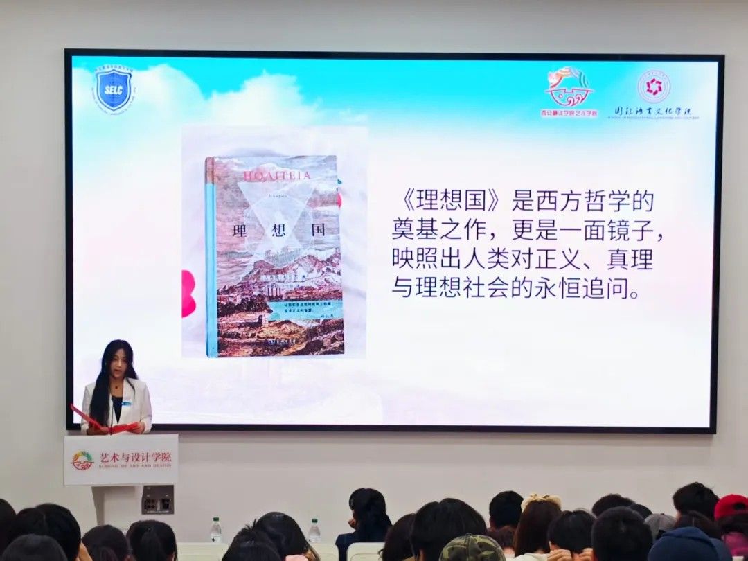 万象城体育awcsport学生会的位豫彤率先登场,她手持《理想国》,以苏格拉底式的追问开场,将柏拉图构建的哲学城邦徐徐展开。她通过剖析正义、美德与政治的辩证关系,结合当下社会热点议题,引导同学们思考理想社会的构建路径,深邃的思想火花在教室中迸发。
