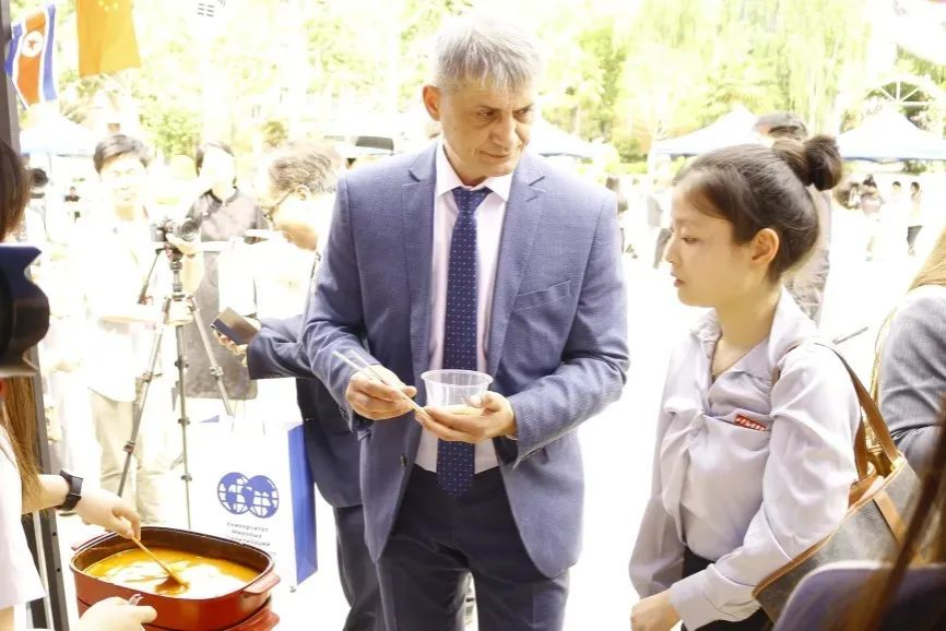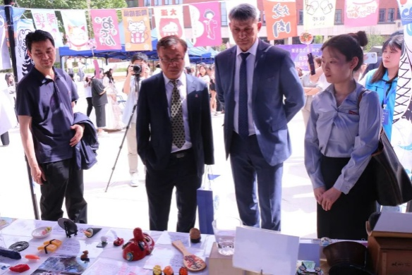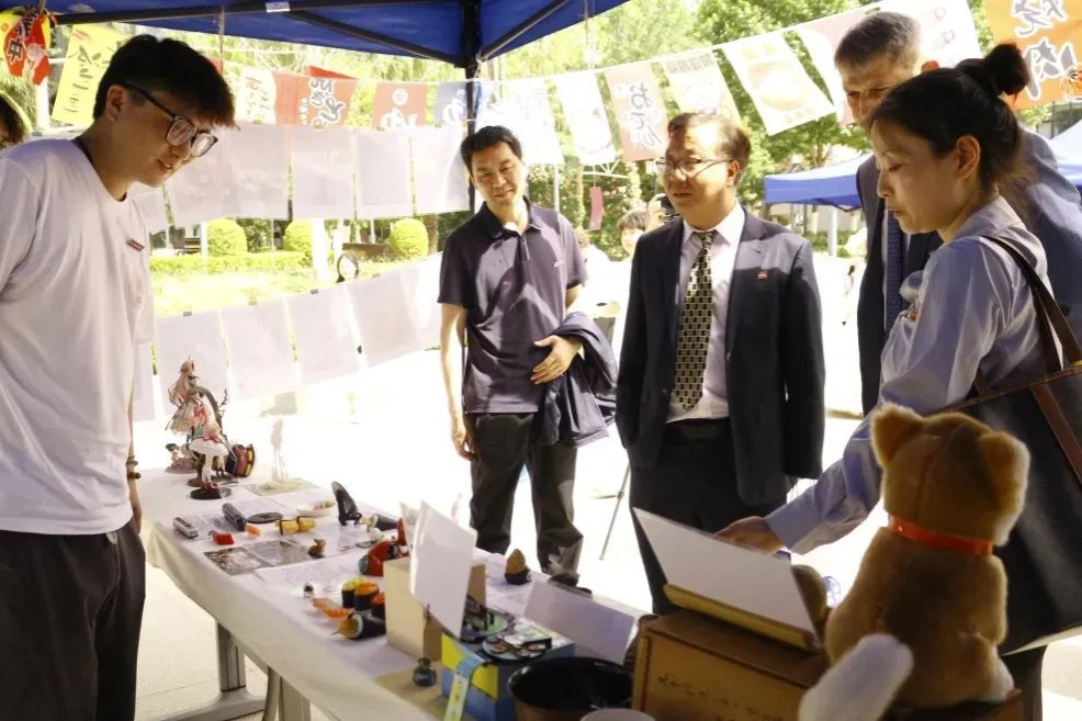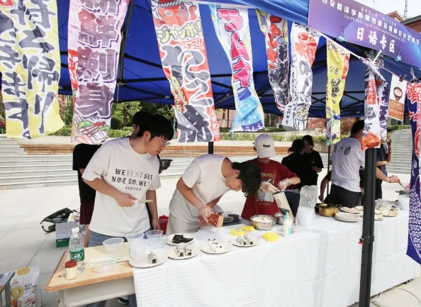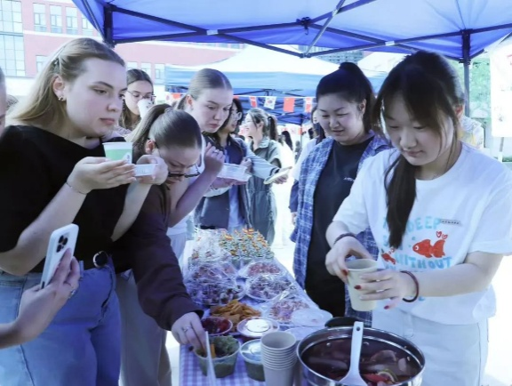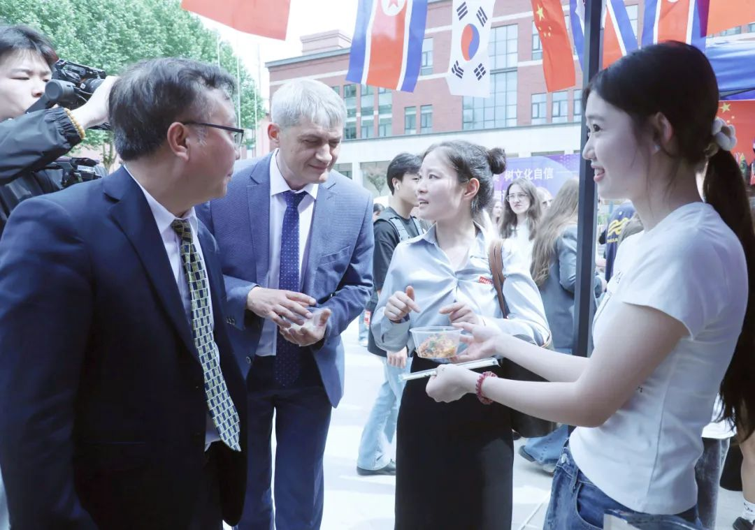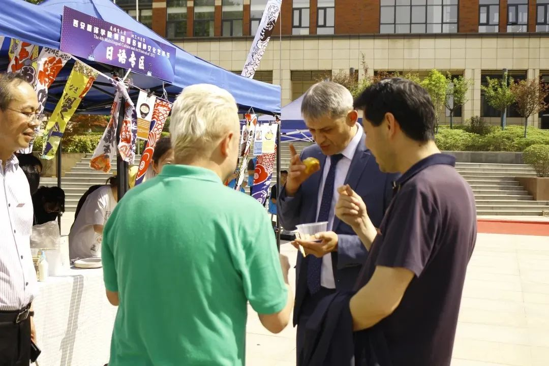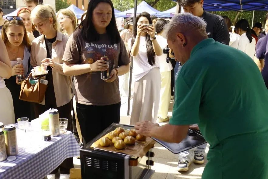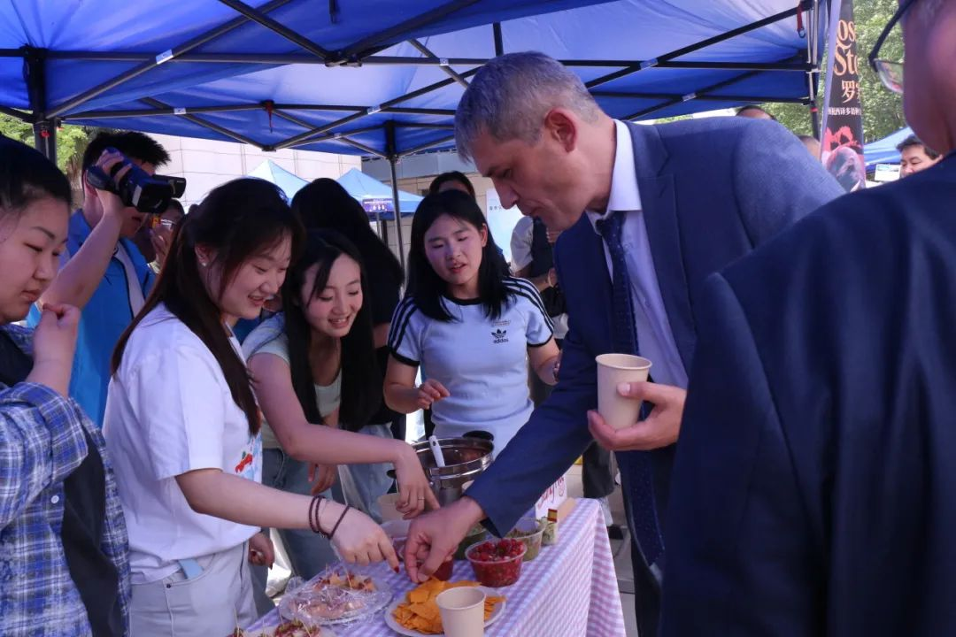 活动来到室外文化体验区,领导们品尝由学生亲手制作的各国特色美食。从精致的日式和果子、到香气四溢的卷饼,碱水面包。每一道美食都承载着不同国家的饮食文化,展现出学生们对各国文化的深入理解与实践成果。室外场所还设置了多语种展示、传统技艺体验等多个展区,丰富的活动内容吸引了众多师生驻足参与,现场学术氛围与文化气息交融,充分彰显了万象城体育awcsport在推动多语种教育与文化交流方面的积极探索与卓越成效。