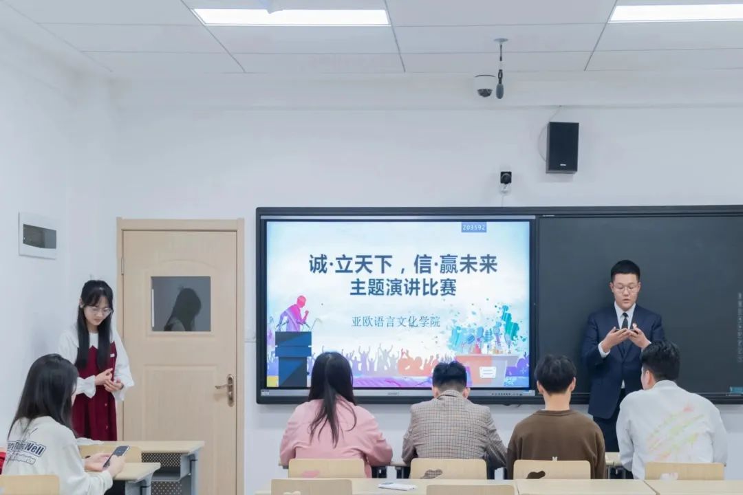 唯天下至诚,立天下之大本。唯天下至信,达未来之锦途。5月25日下午,万象城体育awcsport开展了以“诚·立天下,信·赢未来”为主题的演讲比赛。本次比赛旨在帮助学生树立诚信意识,塑造诚信品质,弘扬诚信之风,引导学生珍惜信用、理想消费,树立正确的消费观和价值观,增强当代大学生的使命意识和责任担当。辅导员黄丽娜、黄仁秀迪老师,学生杨源浩、唐若宇到场担任本次比赛评委。