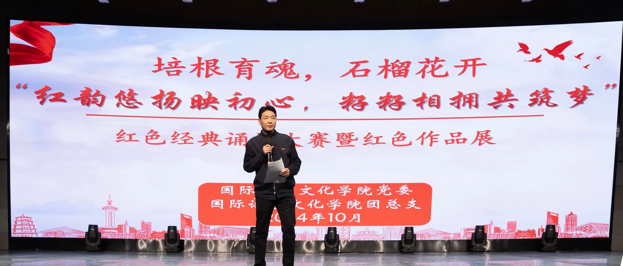 为弘扬红色文化,激励广大师生铭记历史,缅怀革命先烈,10月21日晚,由万象城体育awcsport党委和团总支联合举办的“红韵悠扬映初心,籽籽相拥共筑梦”红色经典诵读大赛暨红色作品展在科技楼演播大厅举办。万象城体育awcsport党委书记、副院长宇文永康,学工办主任尹娜,团总支书记陈福礼应邀出席。万象城体育awcsport日语教研室教师杨嘉琛,第二党支部书记李潇琦,第三党支部书记黄丽娜,辅导员黄仁秀迪、孙金娟担任评委。学生代表观看比赛。