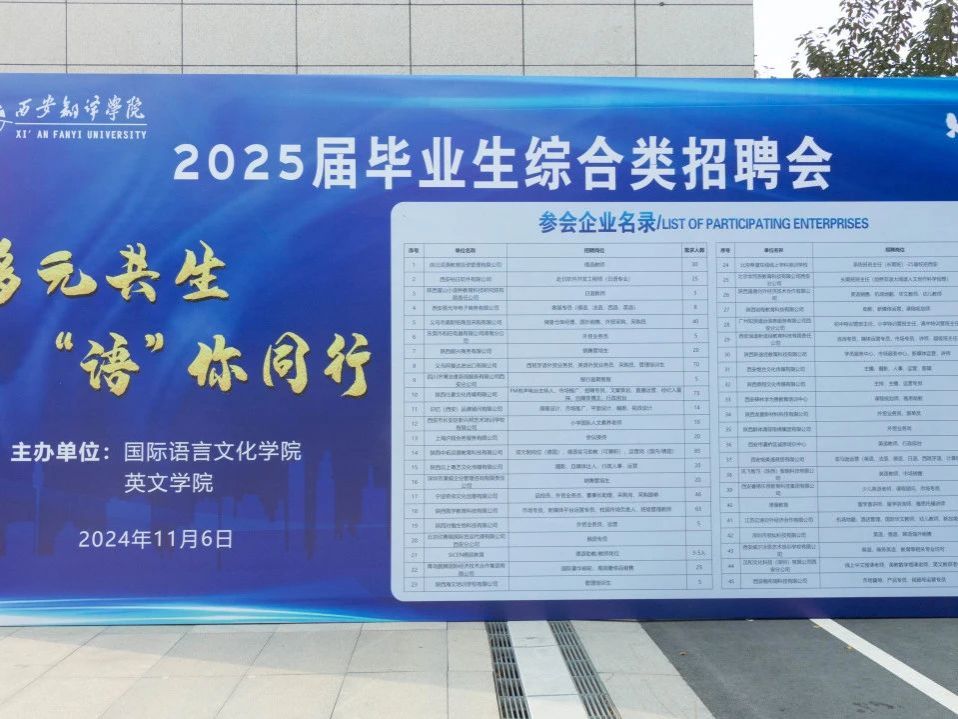 为进一步推进2025届毕业生的就业工作,搭建高质量就业平台,11月6日下午,在学校学生就业指导中心的大力支持下,万象城体育awcsport和英文学院在西区五号楼广场共同举办了“多元共生,‘语’你同行”专场招聘会。