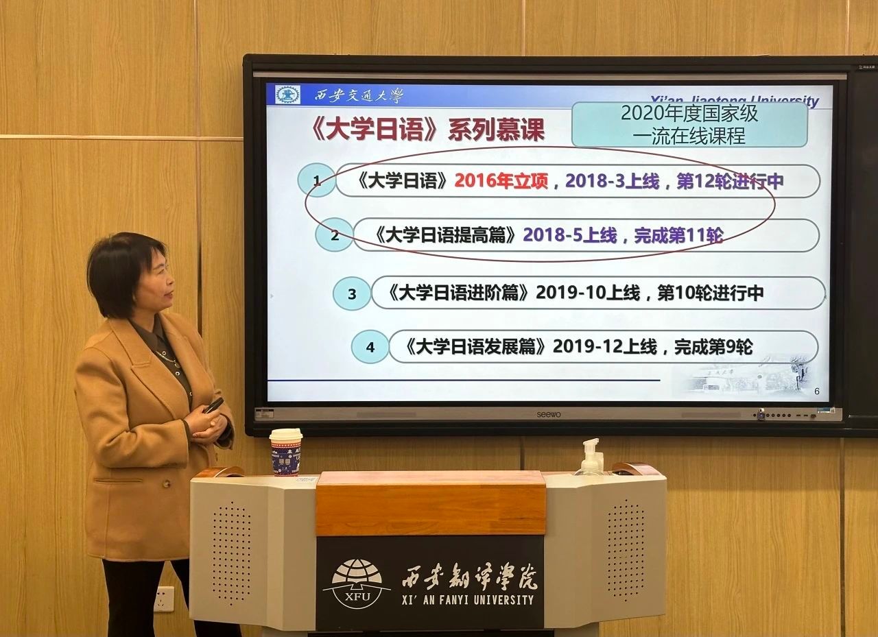 讲座中,张文丽教授介绍了西安交通大学“大学日语”系列国家级一流课程建设的核心理念,并分享了她在SPOC模式下的公共外语课程混合式教学中的实际应用。她深入剖析了如何在课程中引入多种在线学习资源,构建系统的评价指标,并结合实际教学经验,探讨了提升学生在线学习效果的有效方法。张文丽教授强调,教学模式的创新不仅需要技术支持,更需要教学者对教学内容和目标的深入理解。