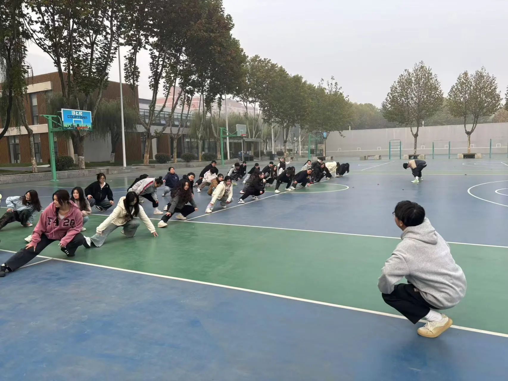 首先,由各班班长带领同学们进行为期10分钟的慢跑热身和关节活动,减少运动中的受伤风险,确保运动的安全性和有效性。