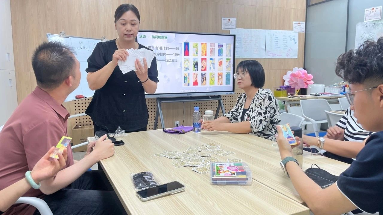 随后,沙龙进入核心环节。张芳老师首先系统介绍了OH卡牌这一心理探索工具的精神内核、适用的心理学理论基础及游戏规则。在张老师的专业引导下,全体辅导员以小组为单位,沉浸式体验了一系列精心设计的OH卡牌探索活动。“脑洞编剧室”活动,激发了大家的创造力,练习如何引导学生进行生涯愿景畅想与叙事构建;“觉察我的感受”活动,通过深化自我情绪体察,提升在辅导中识别与共情学生情绪状态的能力;“自我对话”活动,引导辅导员探索内在声音,为帮助学生进行自我认知与内在对话提供示范;“重新认识自己与团队”活动,在互动中深化自我认知,理解团队动力,如何促进学生个体在群体中的融合与成长;“寻找我的能量”活动,聚焦发掘个人内在资源与优势,探索如何助力学生识别并运用自身能量应对挑战;“压力变形雕塑馆”活动,通过非语言表达释放压力,可视化心理转化过程。