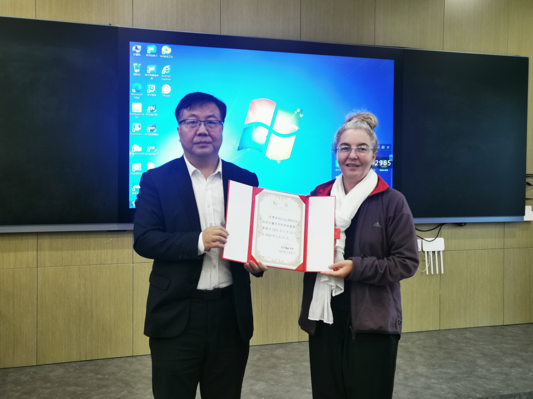 随后,郭炜向凯琳娜·马丁教授颁发客座教授聘书并发表讲话,他介绍了法语系师资力量,强调法语专业在2022年获批陕西省一流专业建设点之后,应该持续加强对外交流合作,凯琳娜·马丁作为我系的特聘教授,将推动我系进一步发展,实现全方位提升。