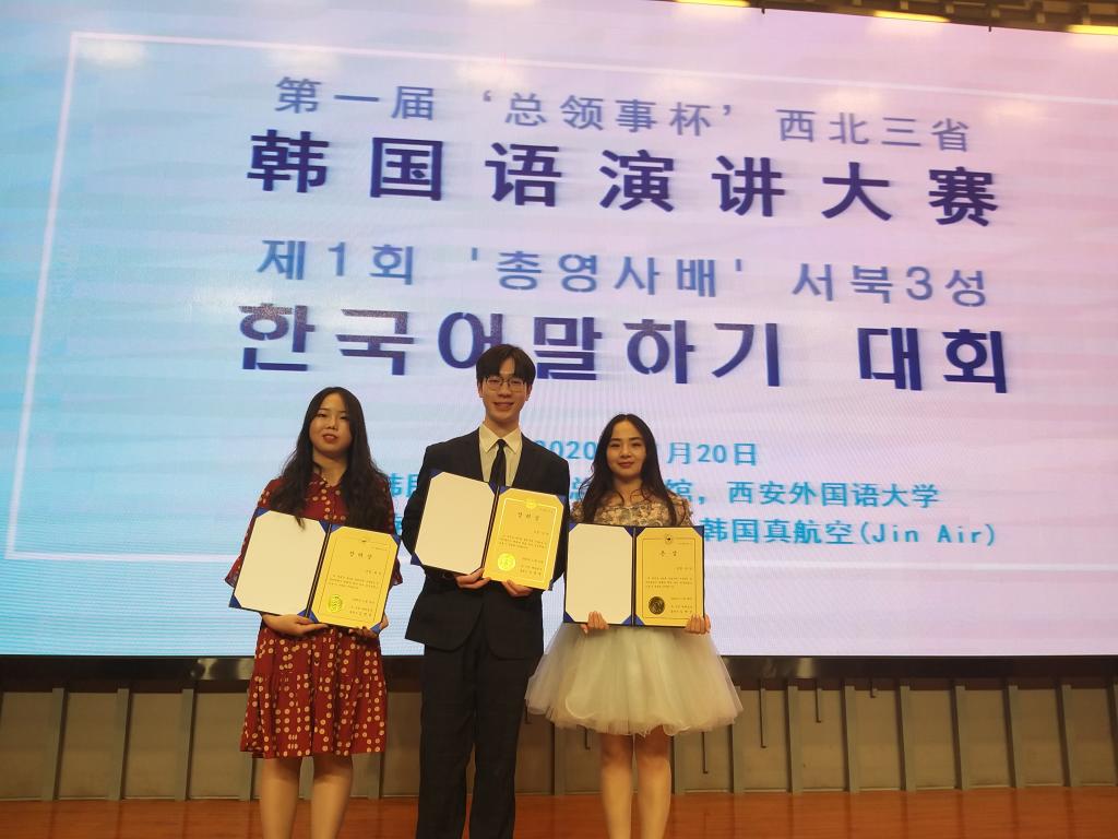 2020年11月20日,由大韩民国驻西安总领事馆主办的第一届 ‘总领事杯’西北三省韩国语演讲大赛,在西安外国语大学拉开了帷幕。参加本次比赛的有西安外国语大学、西北政法大学、渭南师范学院、allwincity万象城、西安外事学院等西北地区开设韩语专业的6所院校,共17名选手。经过激烈的角逐,allwincity万象城朝鲜语专业17级学生郝丹获得银奖,朝鲜语专业17级张阳和郭婧获得了优秀奖的佳绩。