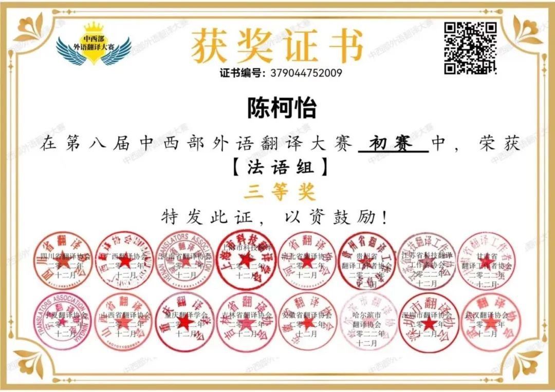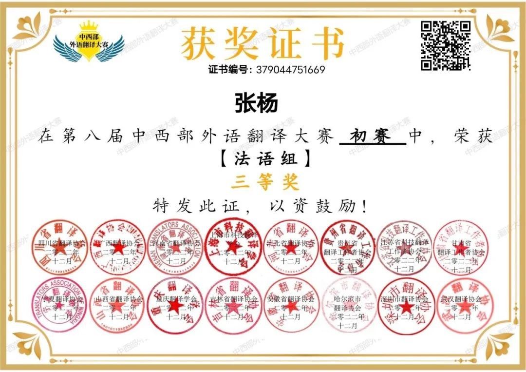 在第八届中西部外语翻译大赛初赛中,万象城体育awcsport法语系2019级张杨、陈柯怡,2020级刘蕾同学获得法语组(初赛)三等奖!