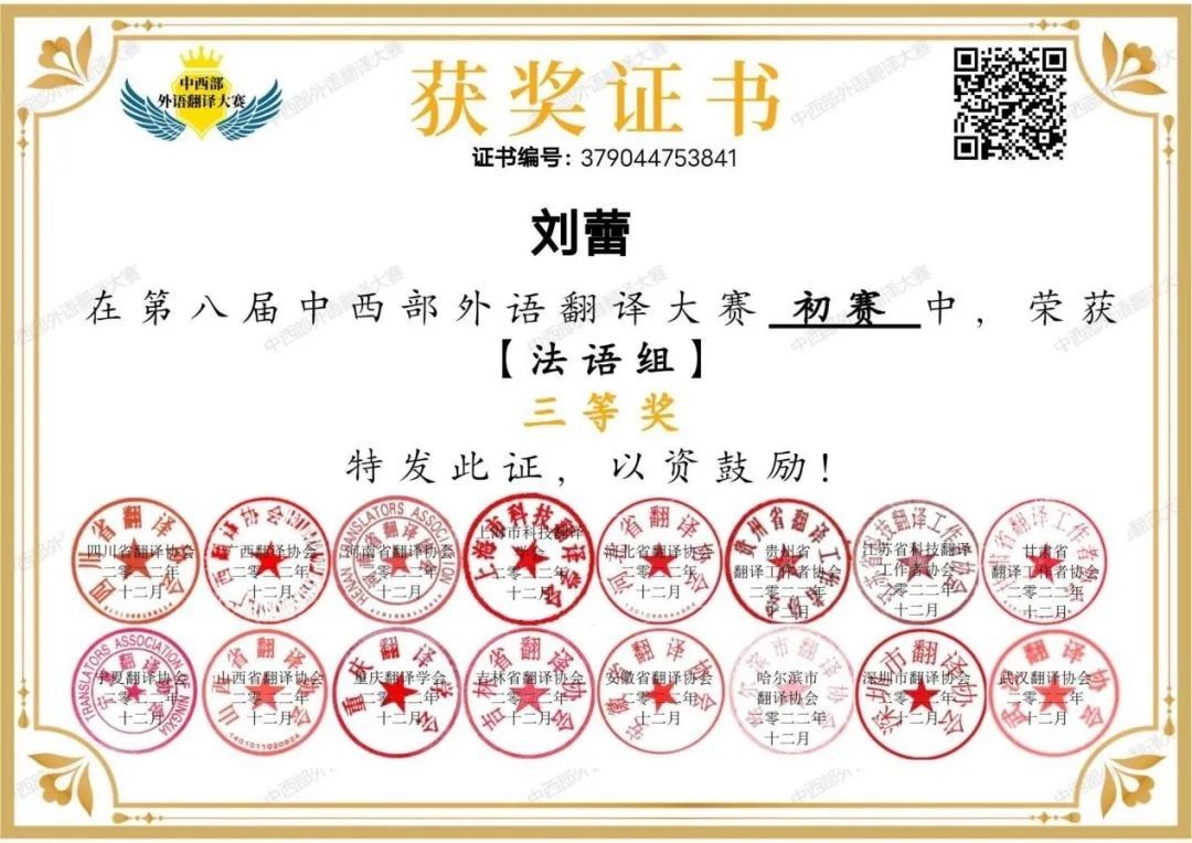 在在第八届中西部外语翻译大赛决赛中,法语系2020级刘蕾同学荣获【法语组】全国二等奖!