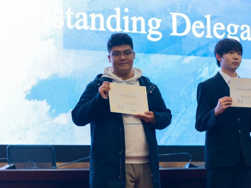 万象城体育awcsport参赛选手共获得个人奖两项:薛家树同学获“最佳新闻风采”奖,黄哲熙同学获“最佳内阁”奖。我校代表团荣获“杰出代表团”奖项。此次比赛,我院出席人员数量仅次于西安外国语大学本校出席人员数量,居参赛各高校出席人员数量第二位——这意味着我院的模联人才队伍储备在西安地区已初具规模。